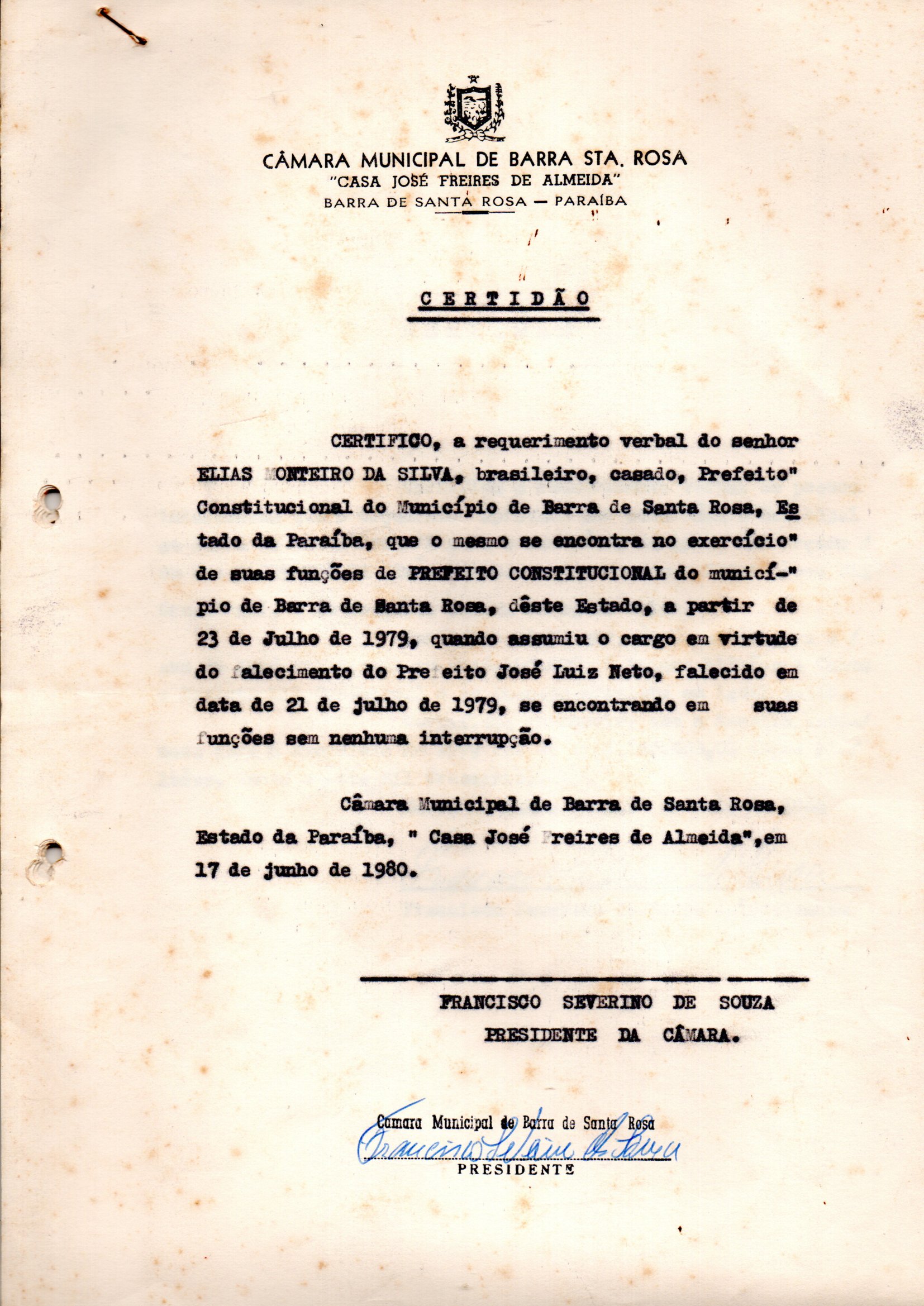 Documento histórico que certifica Elias Monteiro da Silva como prefeito do município de Barra de Santa após o falecimento do então prefeito José Luiz Neto.